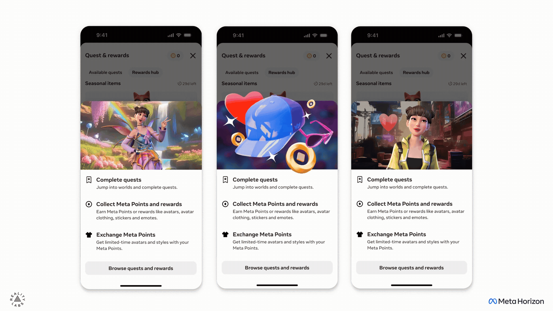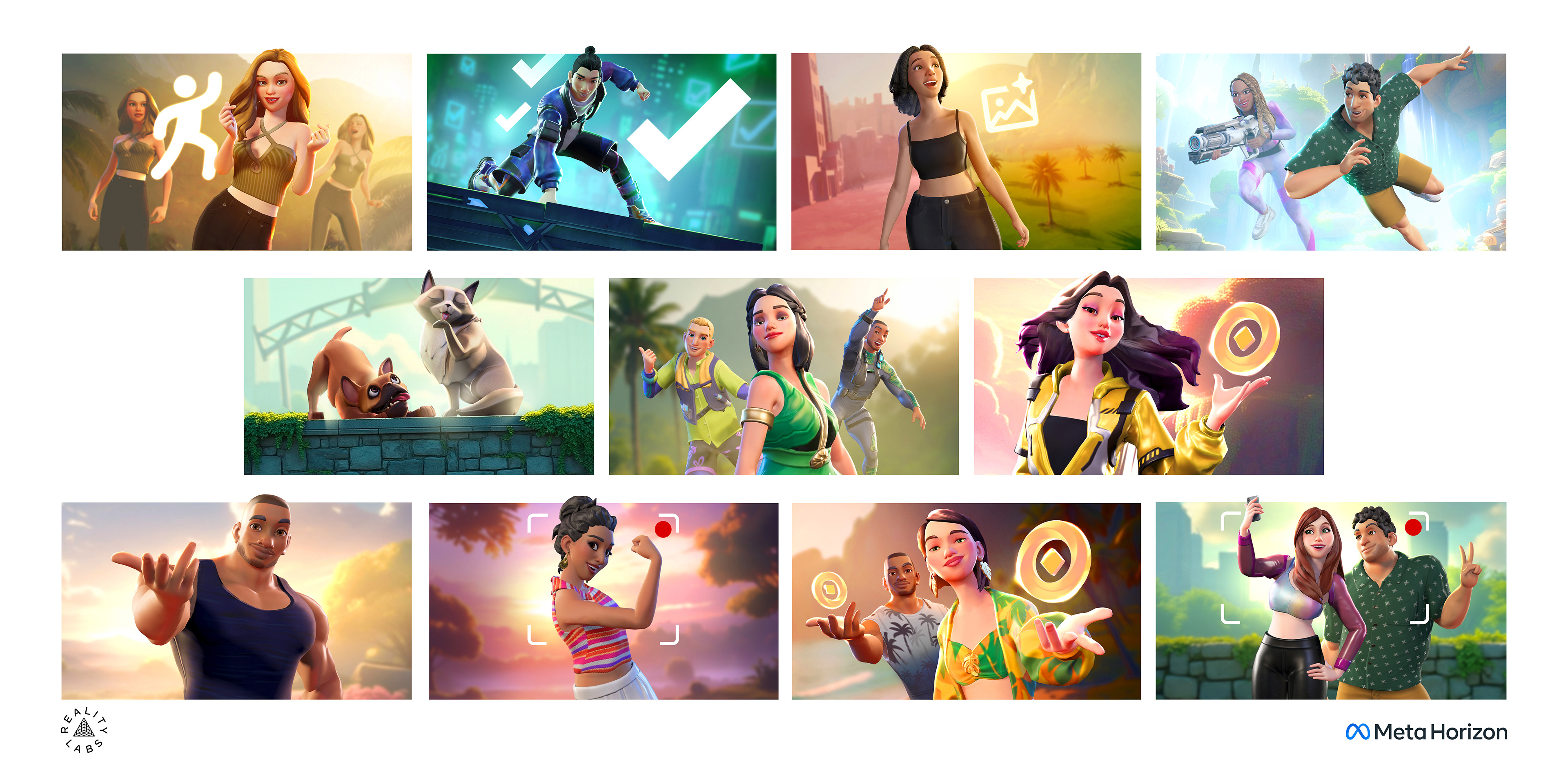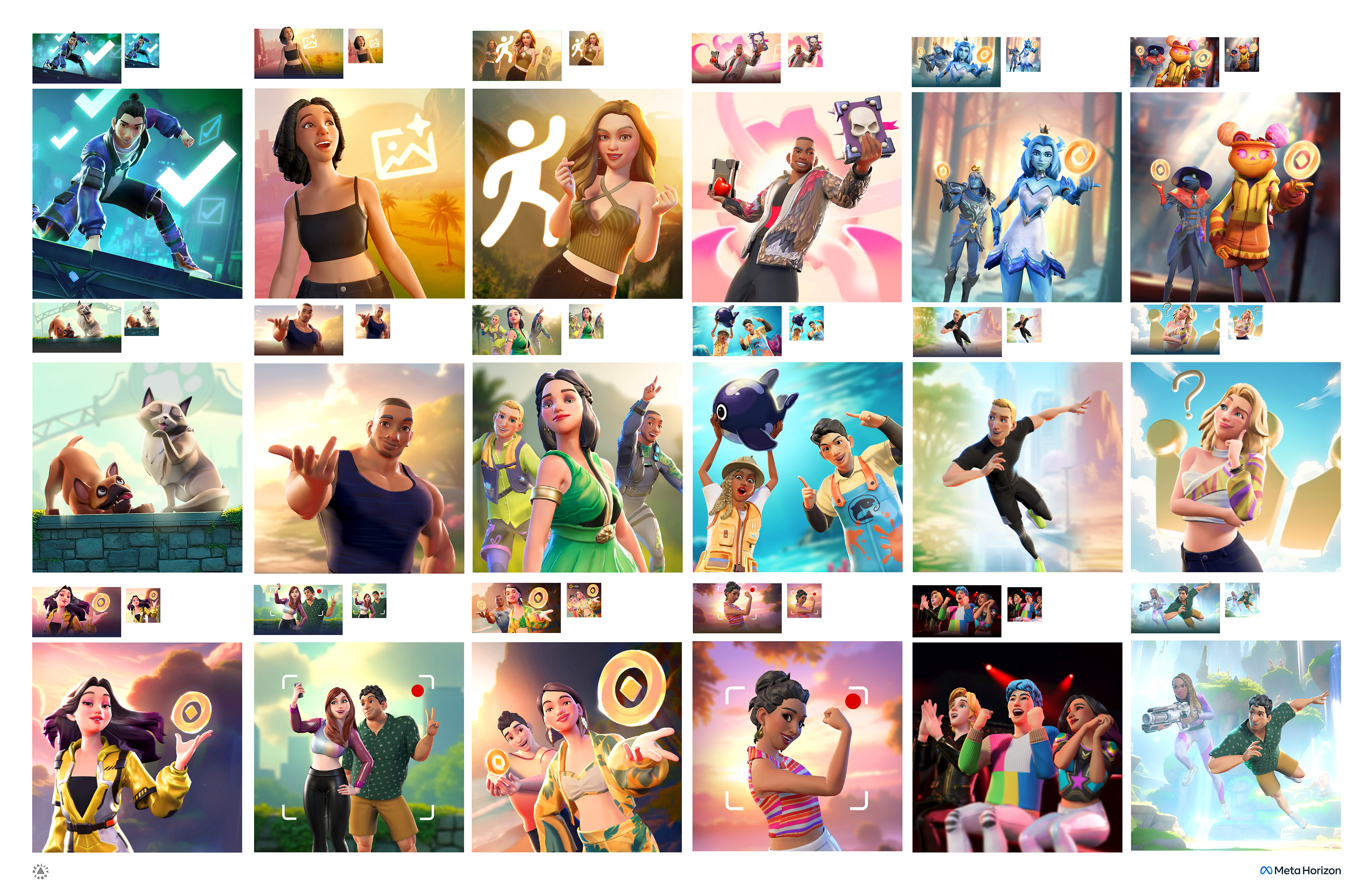 Illustrations for Horizon Mobile. Art Direction: Ricky Baba, Paul Nguyen, Phuc Bui. All imagery owned by Meta. Illustration BGs contain Ai at request of Meta. App Mockups: Pd team. Character Animation: anim team.